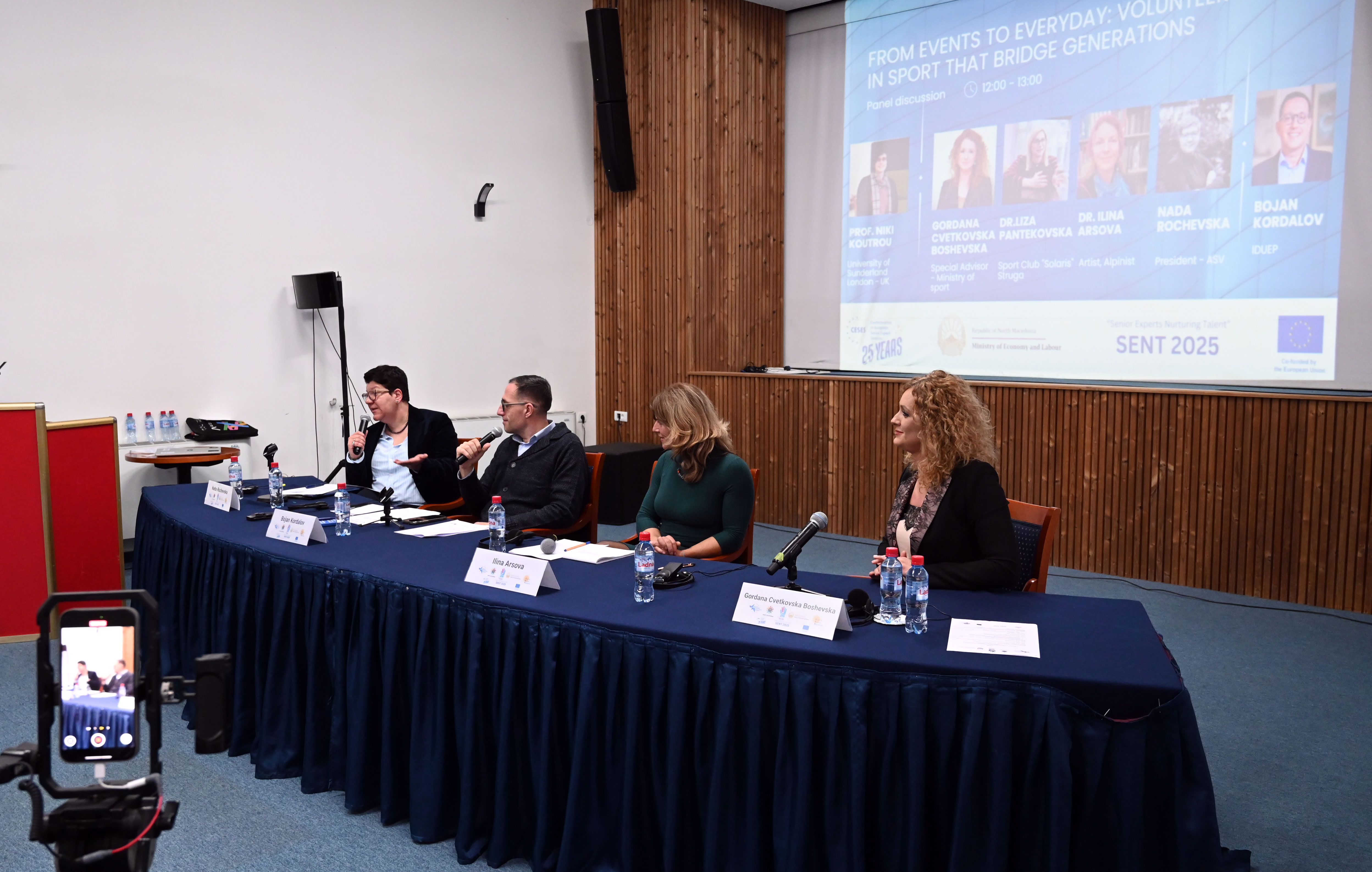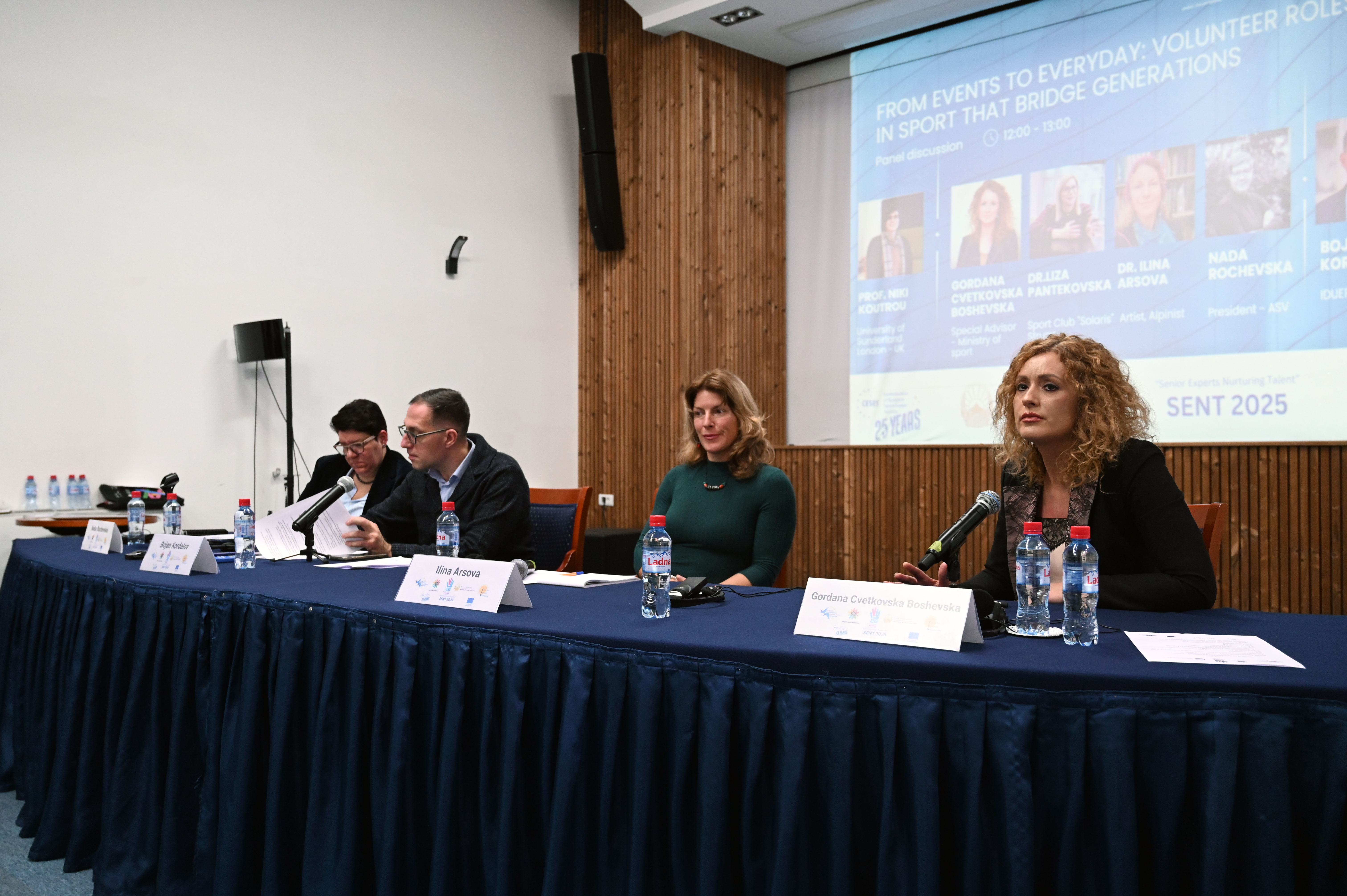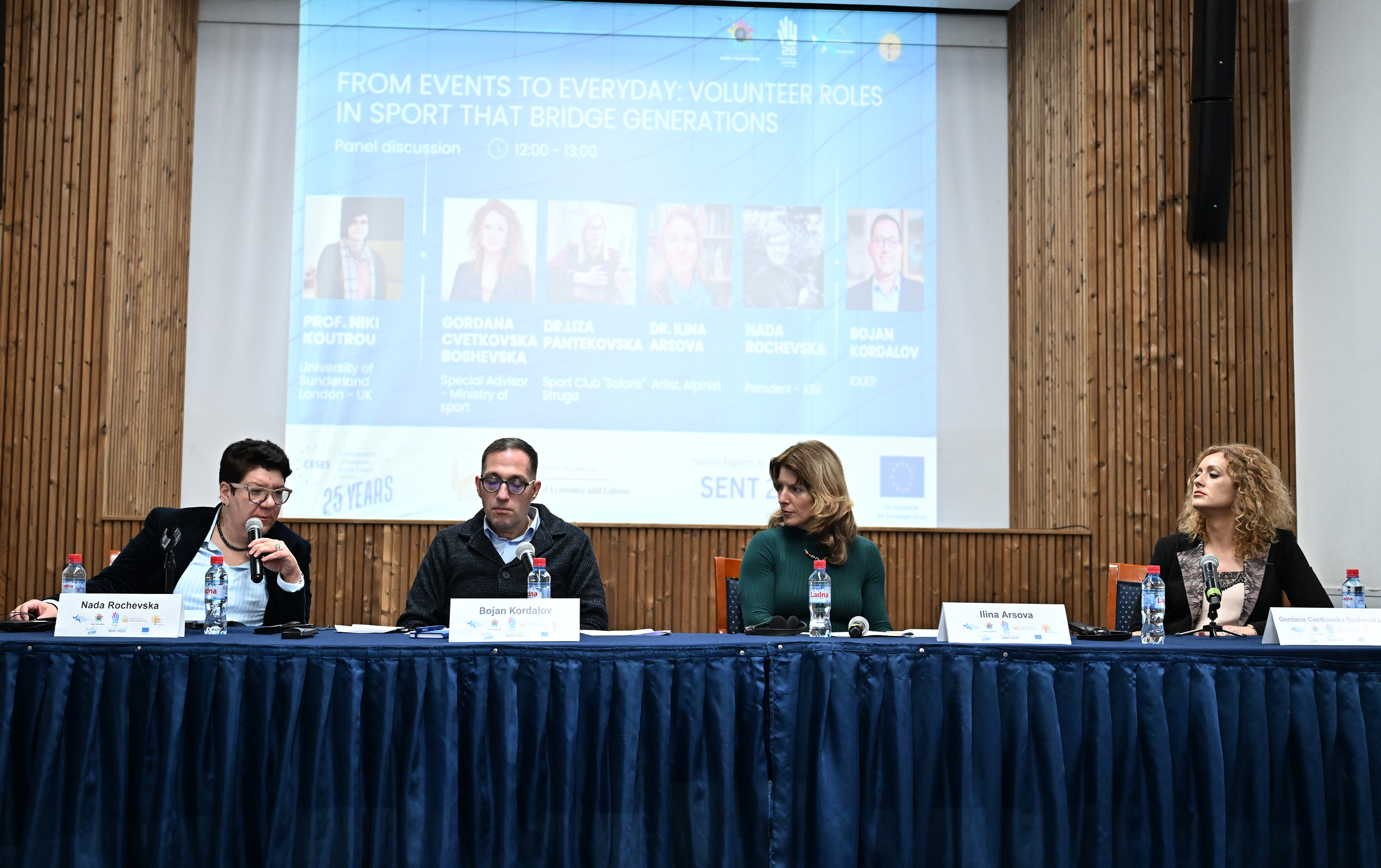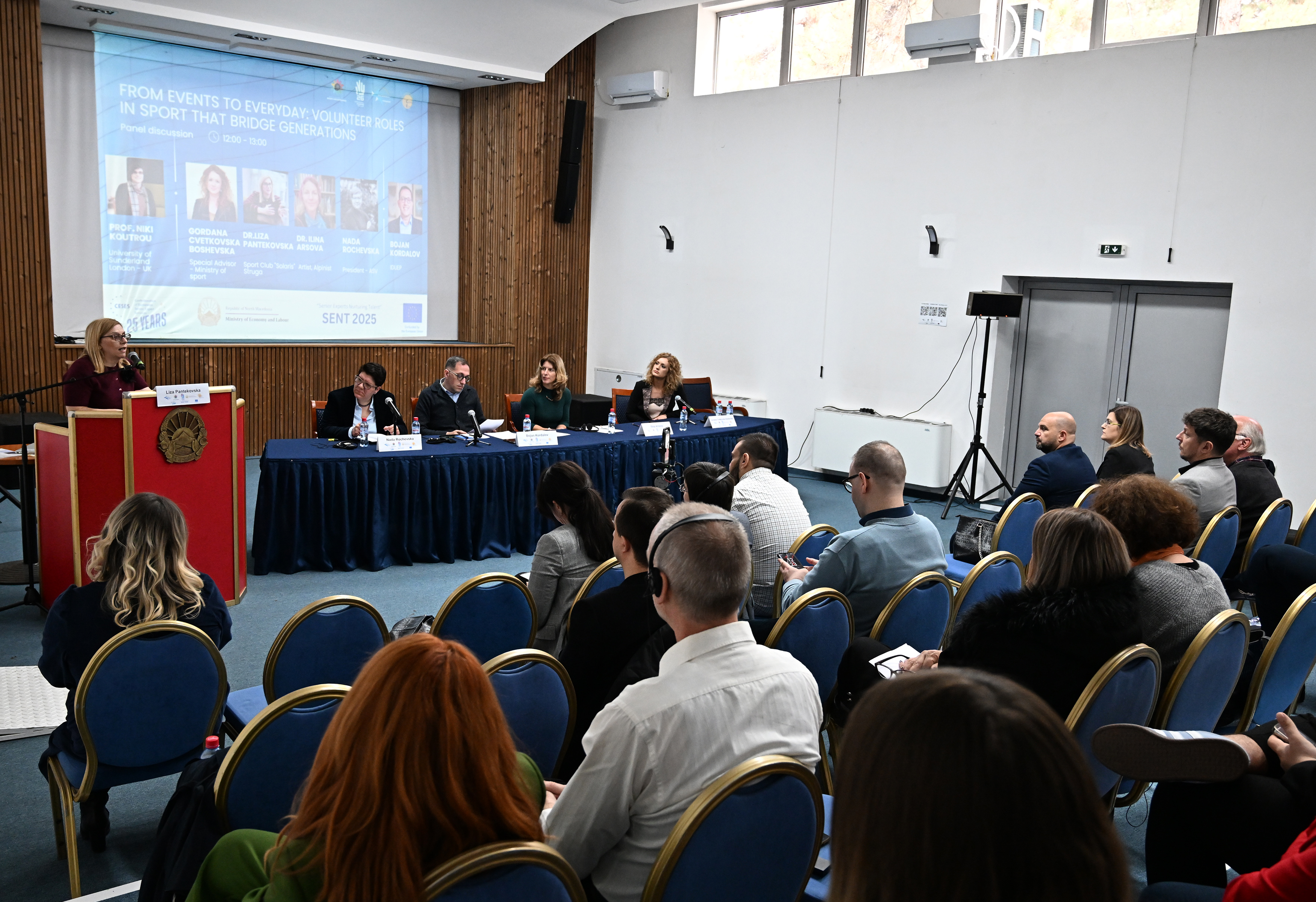 Волонтерство во спортот беше тема на панел-сесијата „Од спортски настани до секојдневие: Волонтерски улоги во спортот што ги поврзуваат генерациите“, на која учествуваа претставници од Министерството за спорт, од националните спортски федерации и здруженија, како и поранешни спортисти и тренери. Во обраќањата на присутните панелисти беше потенцирано дека „спортот е природна и моќна платформа за социјална промена во светот, а волонтерството негова алатка“.